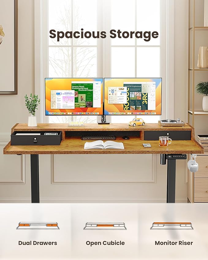 ErGear Electric Standing Desk with Drawers, 63″ x 28″ Gaming Desk with Monitor Stand, C-Clamp Mount Compatible, Home Office Height-Adjustable Desk with Storage Shelf, 4 Preset Heights, Vintage Brown