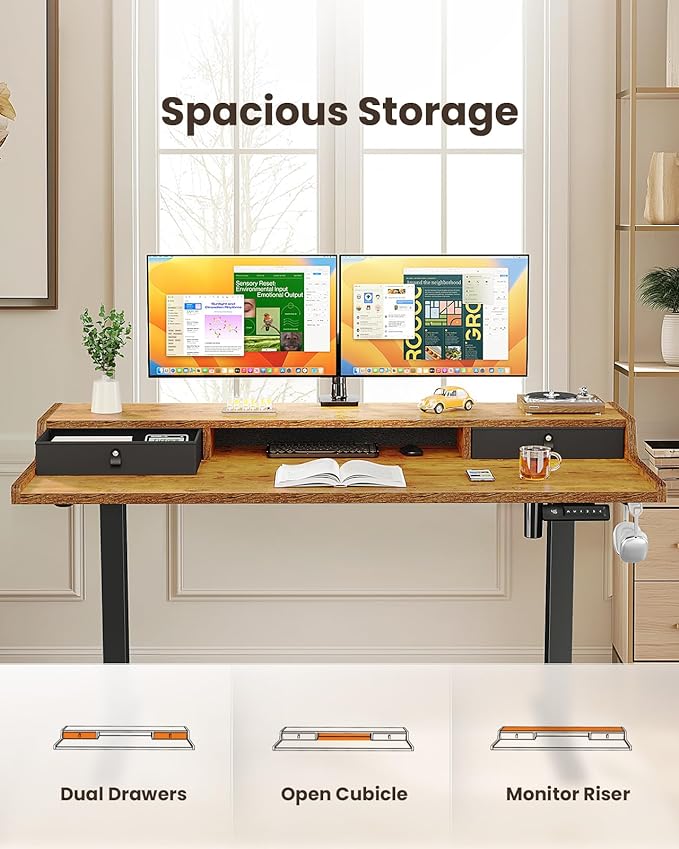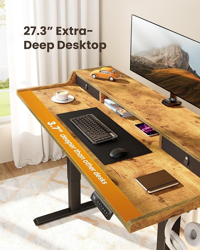 ErGear Electric Standing Desk with Drawers, 55″ x 28″ Gaming Desk with Monitor Stand, C-Clamp Mount Compatible, Home Office Height-Adjustable Desk with Storage Shelf, 4 Preset Heights, Vintage Brown