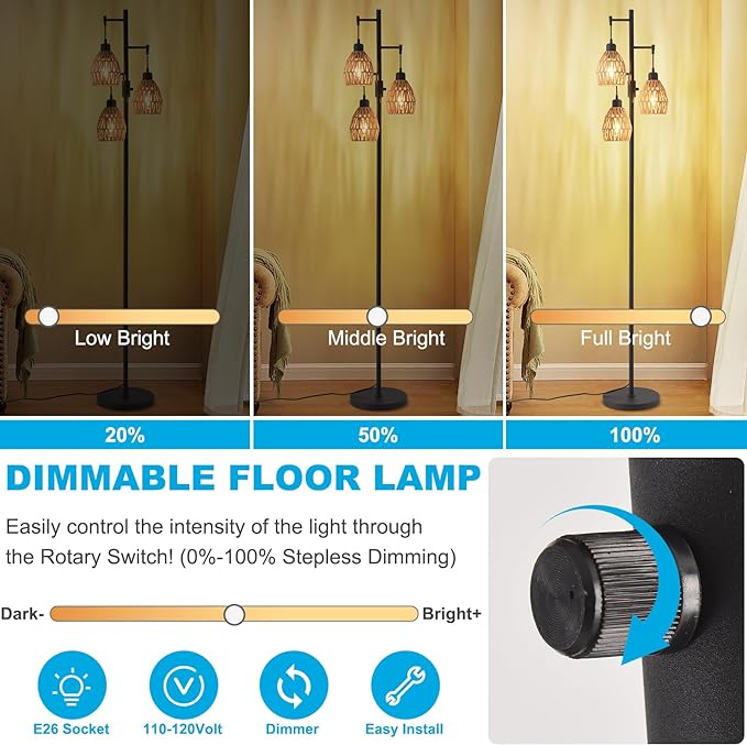 Boho Rattan Floor Lamp - Standing Lamps for Living Room 70'' Dimmable Floor Lamp with Cage Shade, Industrial Farmhouse Floor Lamps Rustic Floor Lamps Vintage Lamp for Living Room Bedroom Office