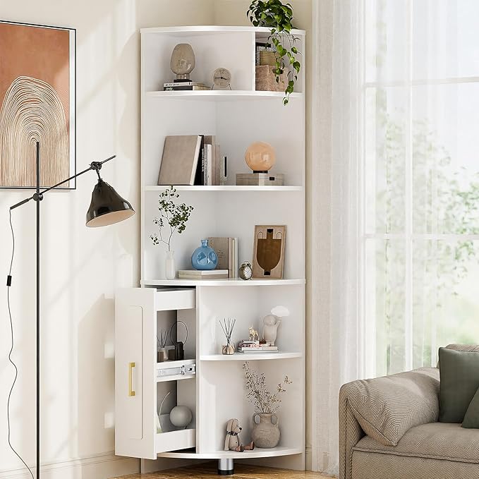 Corner Shelf 6-Tier Corner Bookcase with Drawer, Tall Corner Bookshelf Freestanding White Corner Cabinet Corner Shelves Stand for Wall Corner, Living Room, Home Office, Bedroom, Display Shelf
