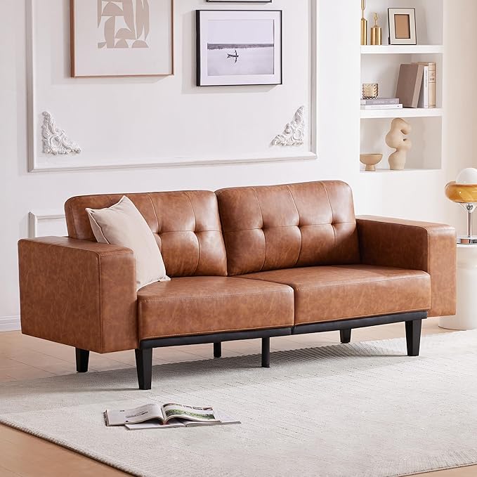 79'' Leather Sofa, 3-Seat Oversized Loveseat Sofa, Mid Century Modern Couch Sofa for Living Room, Deep Brown Faux Leather Couch Bedroom Apartment with Solid Wood Legs Upholstered Cushion, Brown