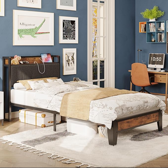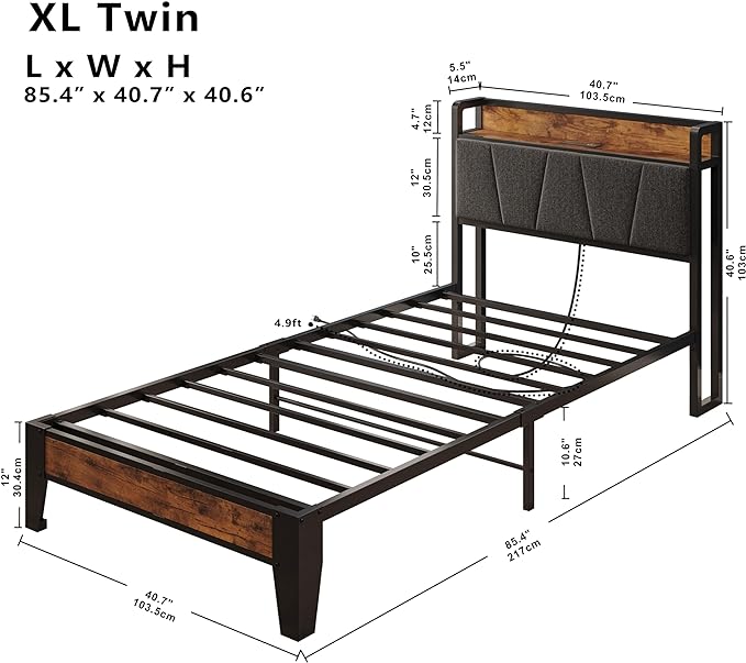 LIKIMIO Twin XL Bed Frames, Storage Headboard with Charging Station, Solid and Stable, Noise Free, No Box Spring Needed, Easy Assembly