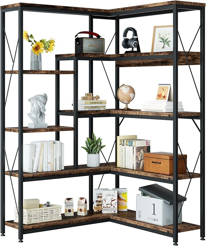 Shintenchi 5 Tiers Corner Bookshelf, 70.86" Tall L-Shaped Bookcase, Large Corner Etagere Bookcase, Corner Shelf Display Storage Rack with Metal Frame for Living Room Home Office, Rustic Brown