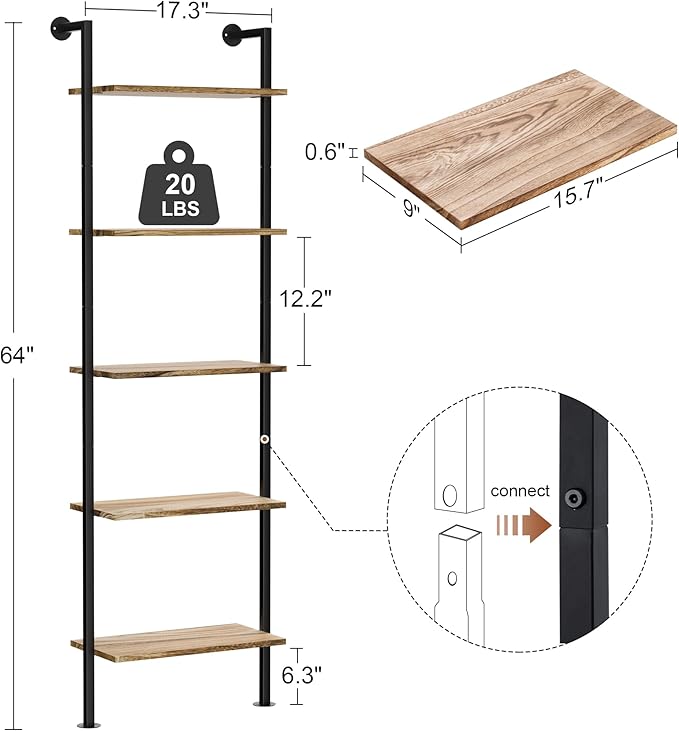 About This 【Compact and Functional Design】 The open ladder shelf is wall-mounted and measures 64"H x 17.34"W x 9"D, providing...