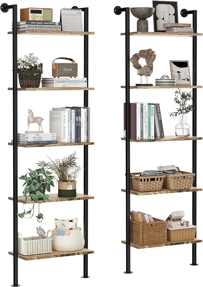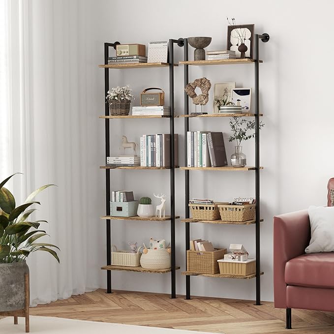 5-Tier Bookshelf Solid Wood Ladder Shelf, Narrow Book shelf Set of 2, Wooden Ladder Shelf Bookcase, Wall Mount Ladder Shelf, Storage Rack for Living Room, Bedroom, Industrial Style, Rustic Brown