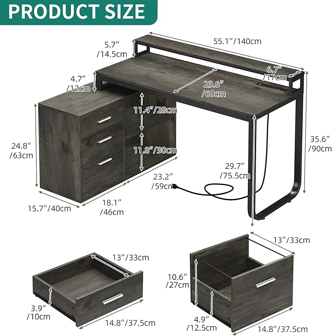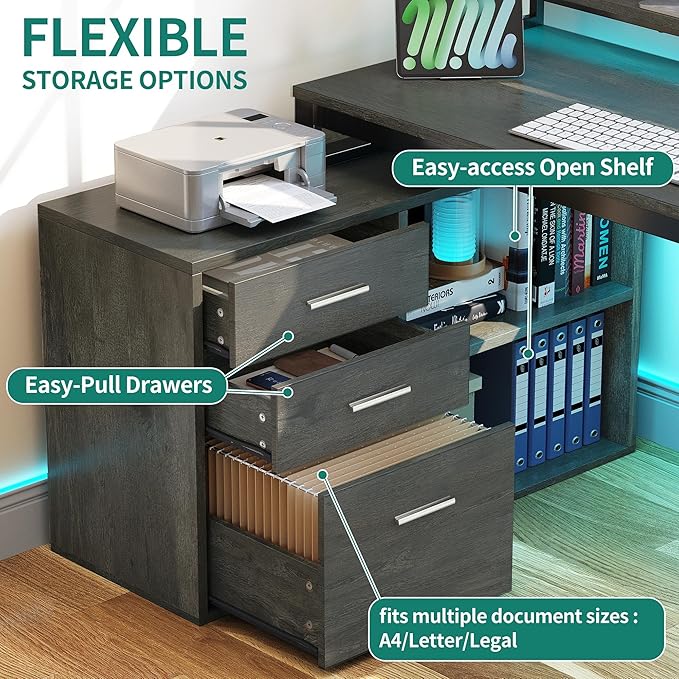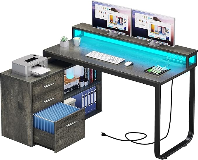 YITAHOME L Shaped Desk with Power Outlets & LED Lights & File Cabinet, 55" Corner Computer Desk with 3 Drawers and 2 Storage Shelves, Home Office Desk with Monitor Stand, Grey