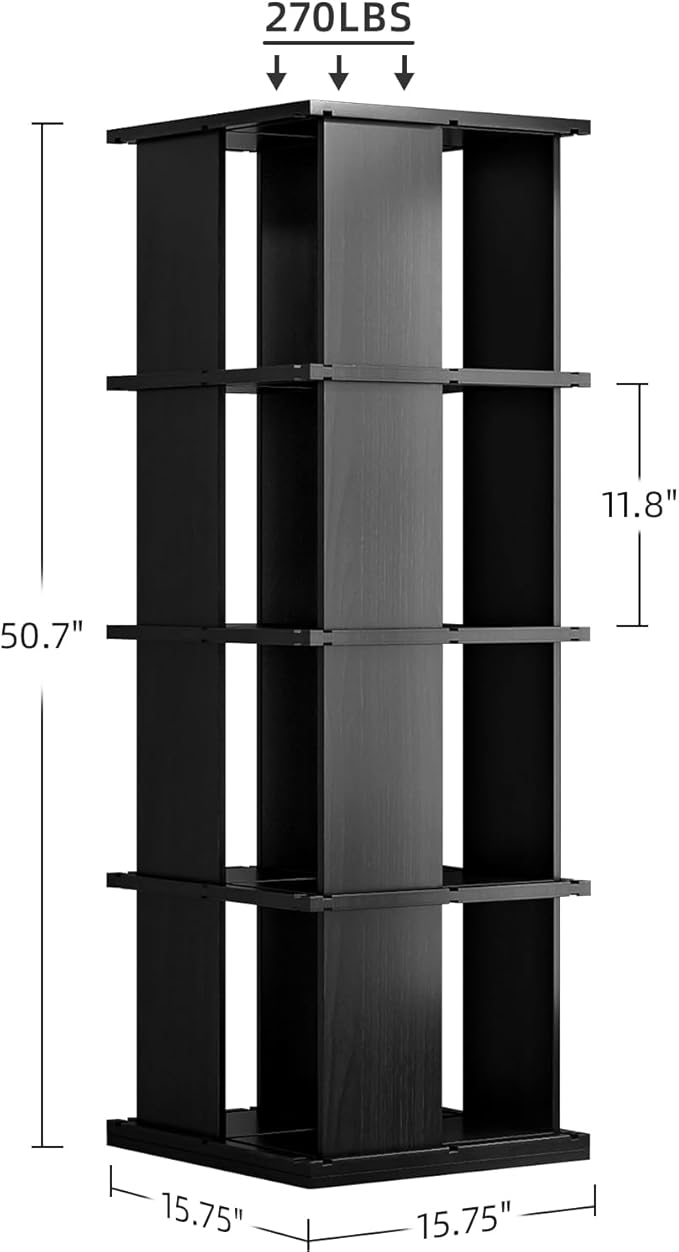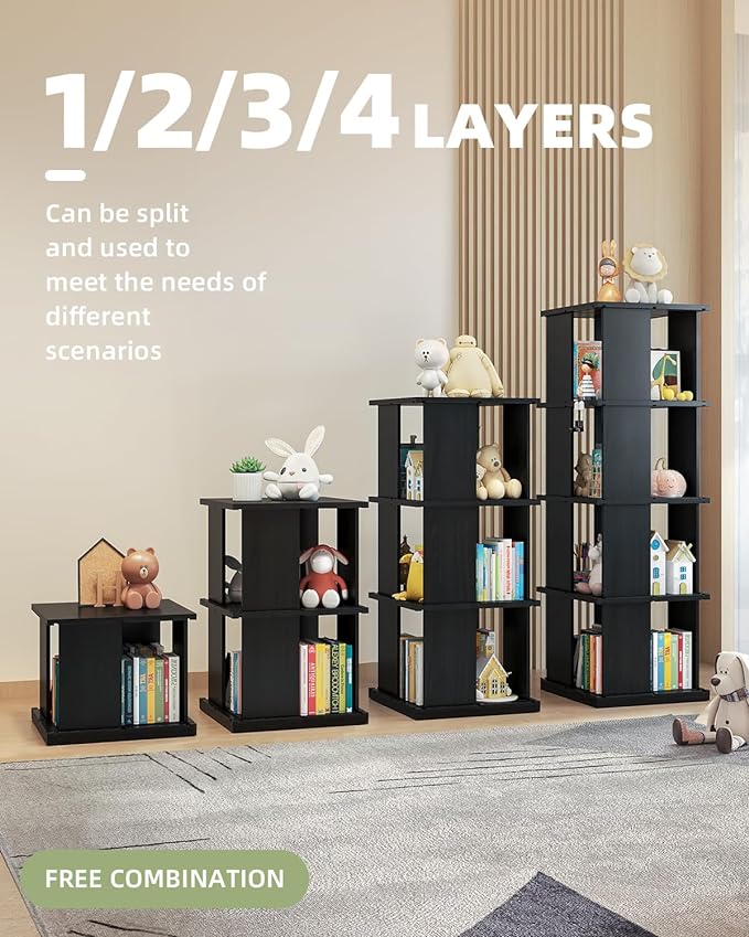 Rotating Bookshelf, 4-Shelf 360° Solid Wood Book shelf Tower, Stackable Revolving Bookcase Organizer for Living Room, Bedroom, Study(Black)