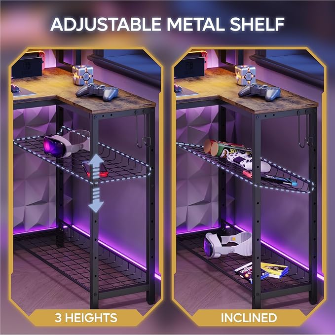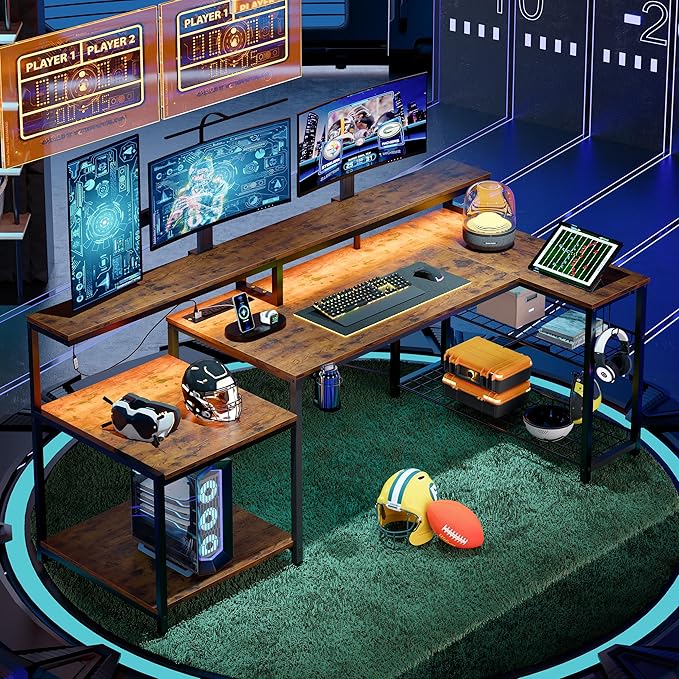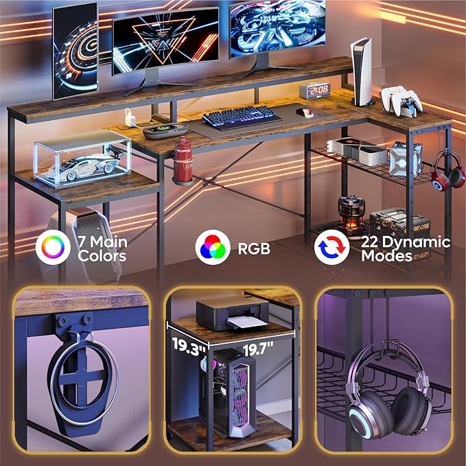 Bestier 71.5 inch Computer Desk with Power Outlets, LED Large Home Office Desk with Monitor Stand, L Shaped Corner Desk with Printer Stand Adjustable Shelf, Cup Holder & Headset Hooks, Brown