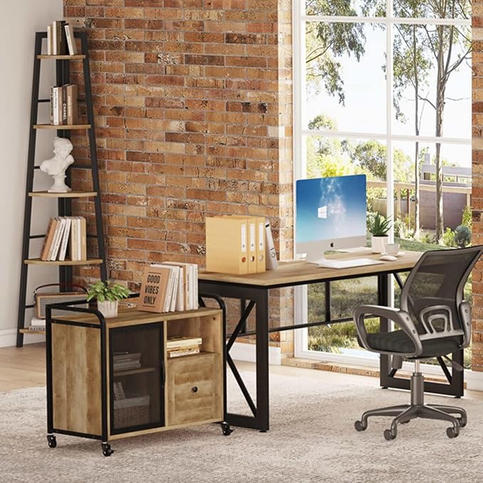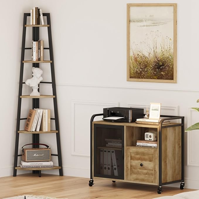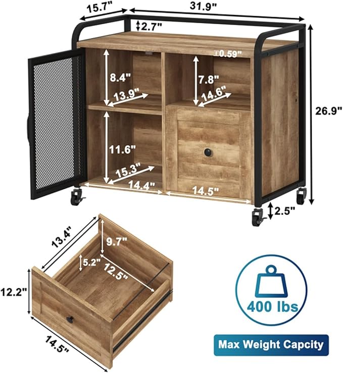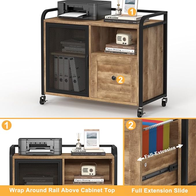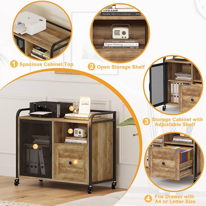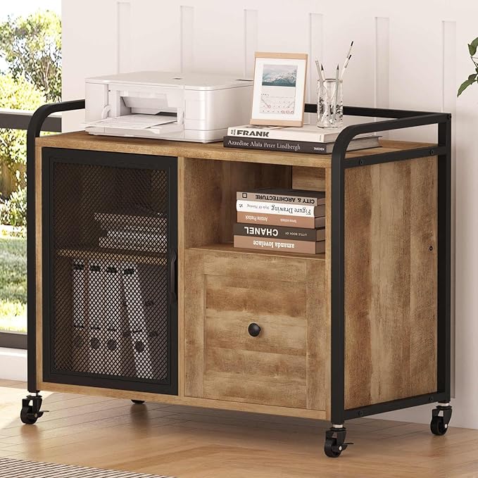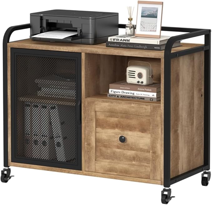 BON AUGURE Filing Cabinet for Home Office, Lateral File Cabinet with Drawer for Letter/ A4 Size, Mobile Printer Stand with Open Storage (Vintage Oak)