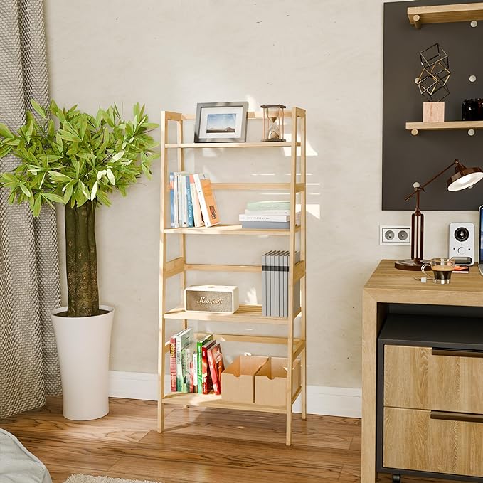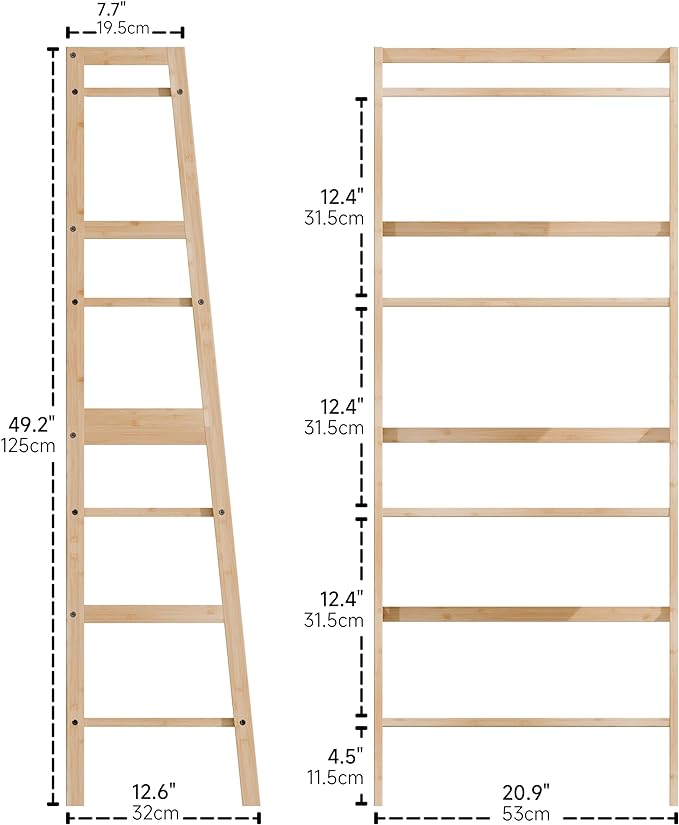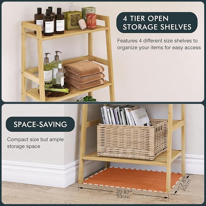 Ladder Shelf, 4-Tier Bookshelf, Bamboo Leaning Bookcase, Display Storage Rack Organizer, Freestanding Flower Plant Stand for Living Room, Home Office, Kitchen, Natural