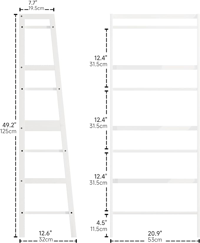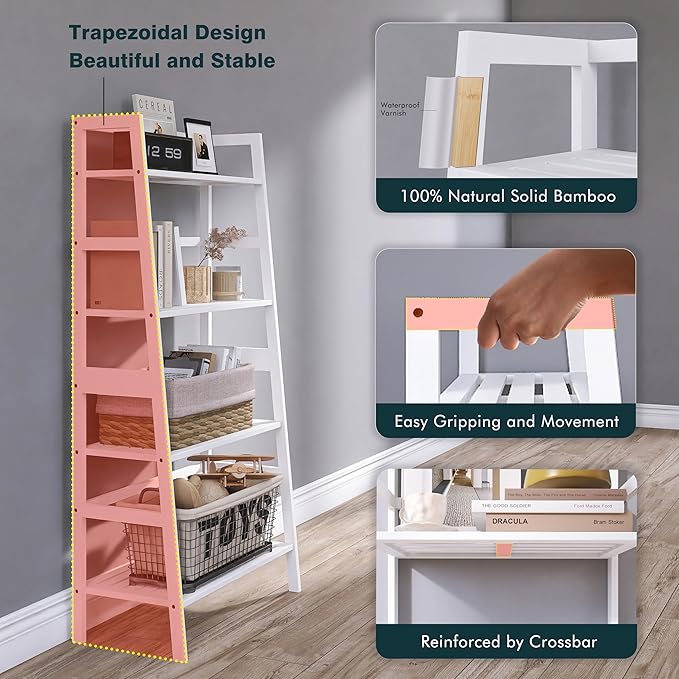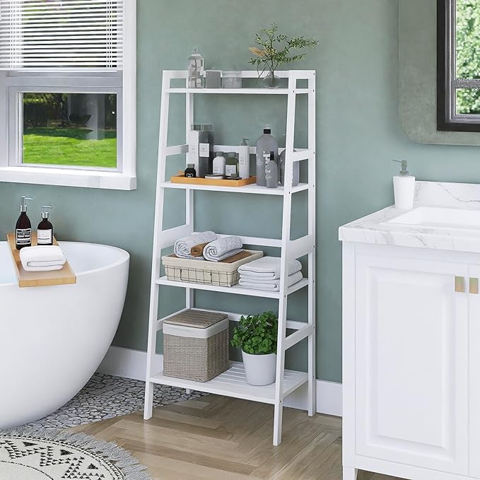 White Ladder Bookshelf, Leaning Bookcase, 4-Tier Bamboo Shelf, Floor Standing Storage Shelving Unit, Open Display Book Shelves