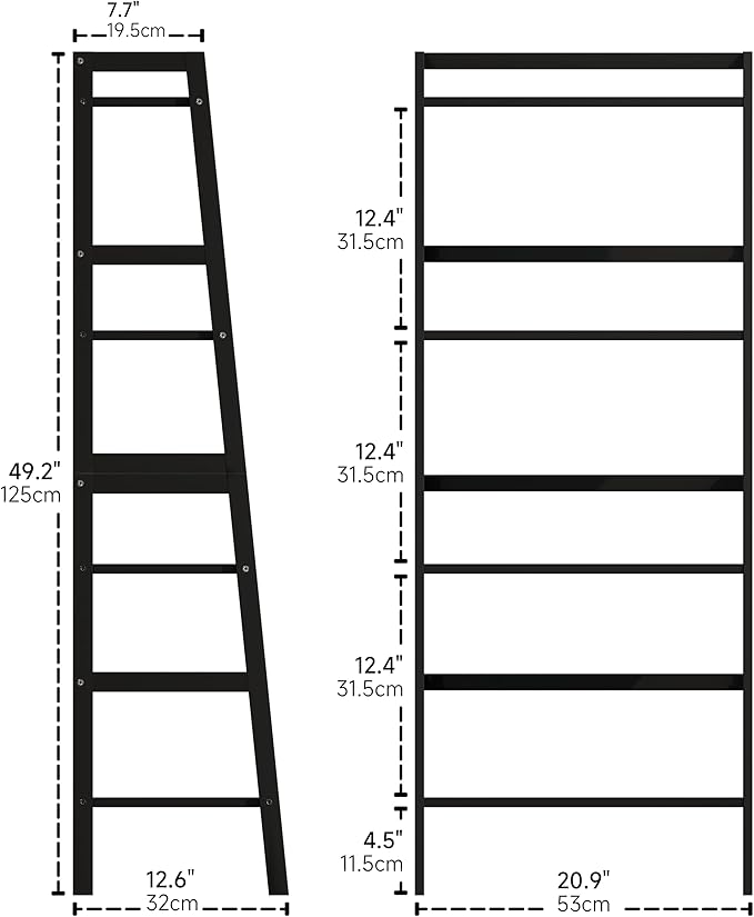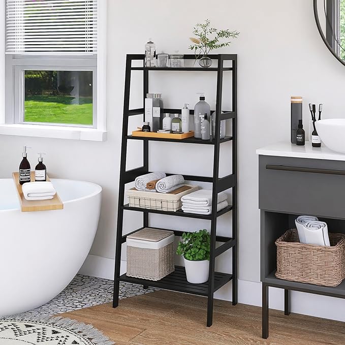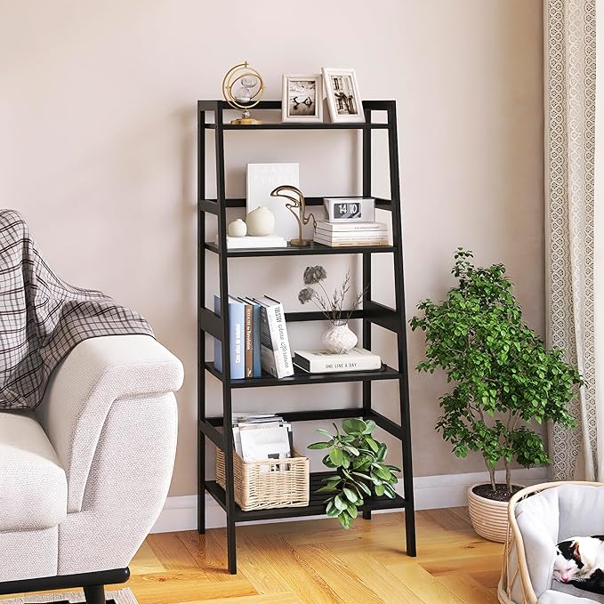 Black Bookshelf, 4-Tier Ladder Shelf, Freestanding Leaning Bookcase with Bamboo Shelves, Space Saving Flower Plant Stand for Small Space