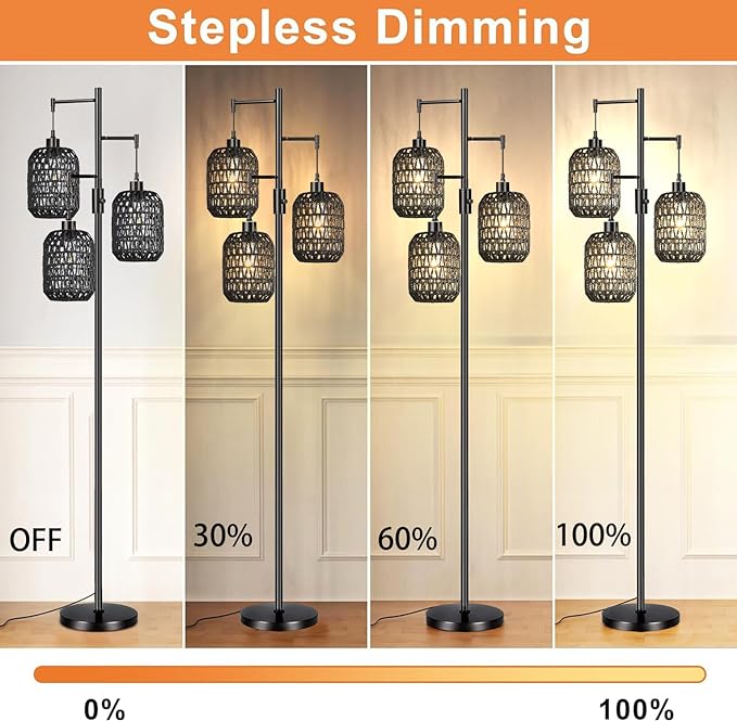 Floor Lamp for Living Room,Bedroom,Boho Rattan Floor Lights,Dimmable Industrial Black Farmhouse Tree 3 Standing Lamp Wicker Rustic Tall Lamp,Woven Bamboo Lamp Shade Floor Lamps Bohemian