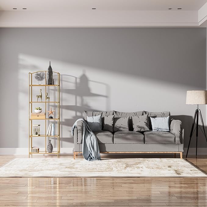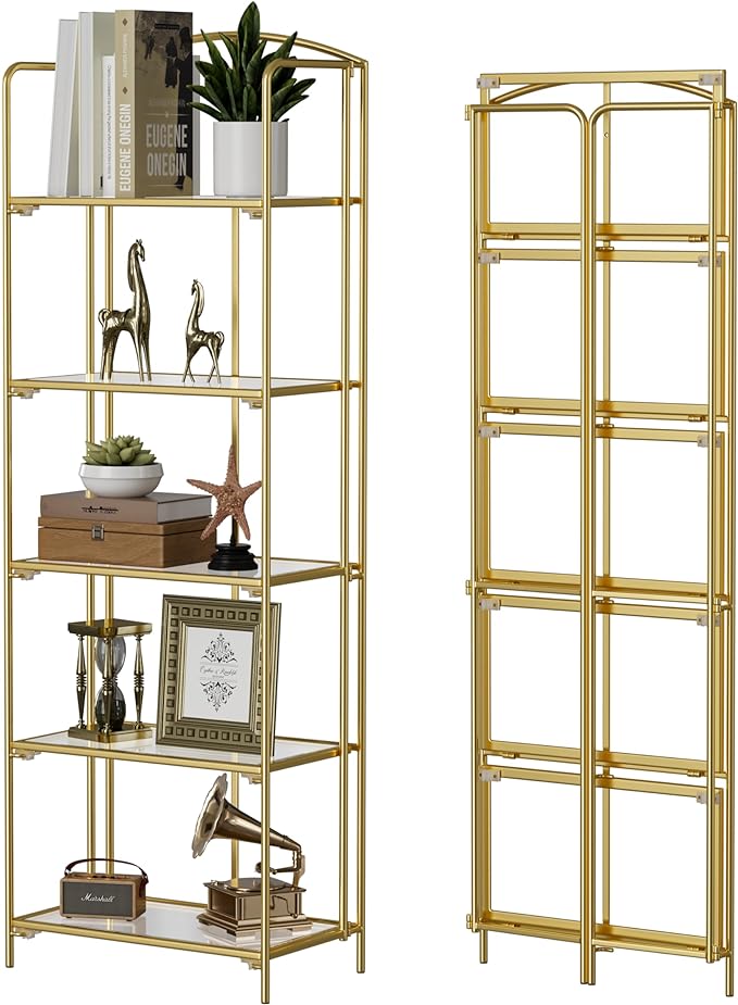 No Assembly Folding Bookshelf, 5 Tier Gold Bookshelf, Metal Book Shelf for Storage, Folding Bookcase for Office Organization and Storage, 12.87" D x 22.91" W x 68.1" H