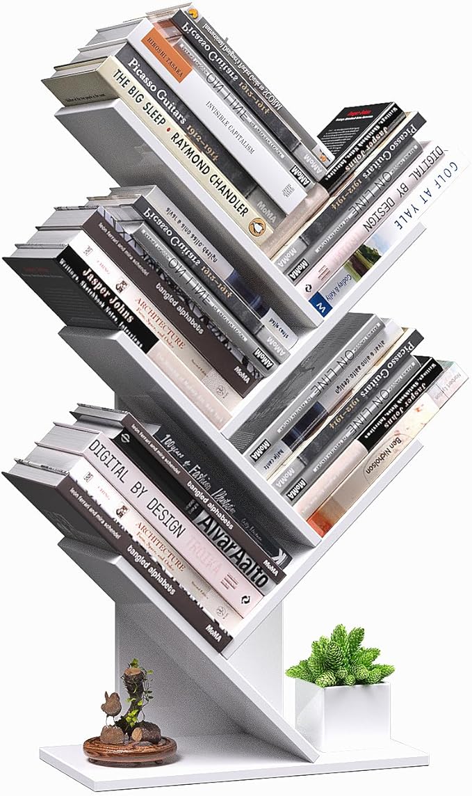 5 Tier Small Tree Bookshelf Desk Book Organizer Narrow Bookcases for Books Magazines CDs Free Standing Retro Wooden Storage Shelves for Home Office Bedroom Living Room White