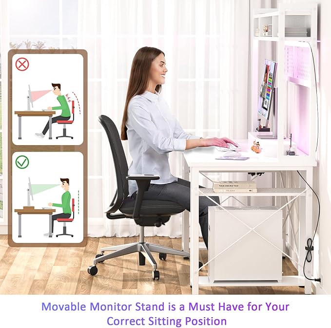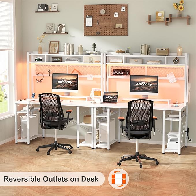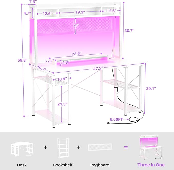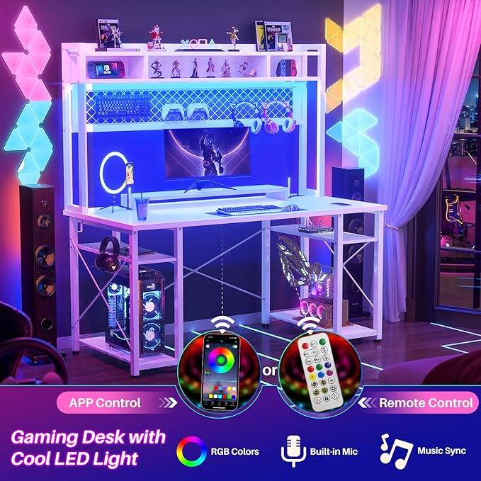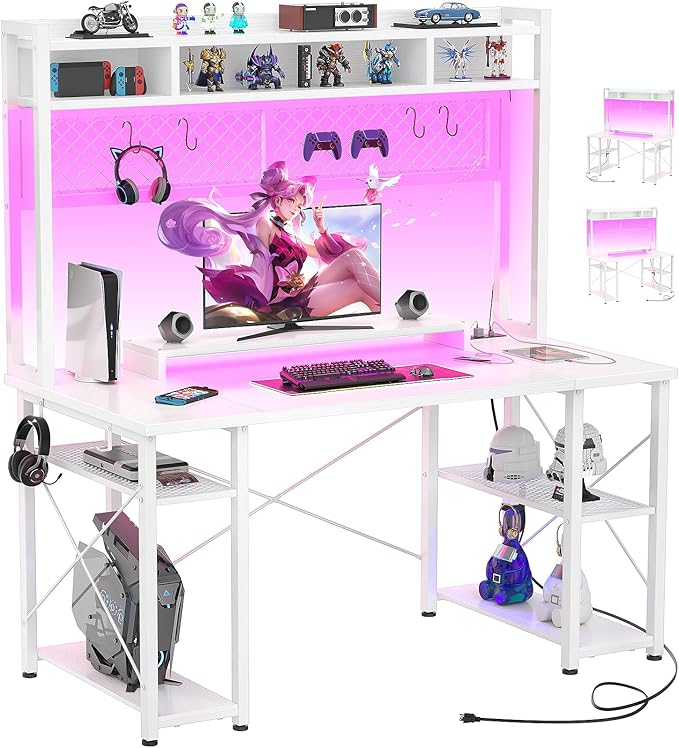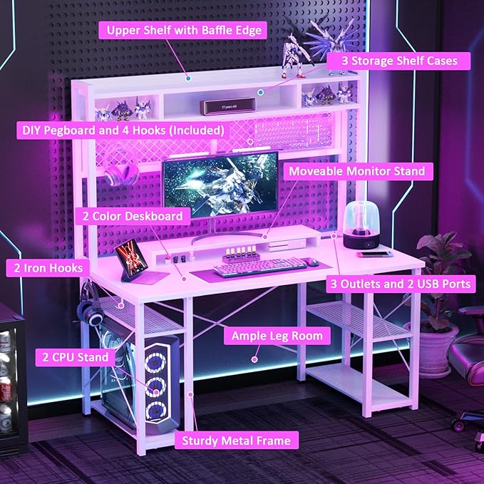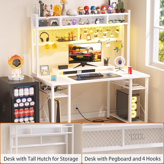armocity 2024 Upgrade Gaming Desk with Hutch, 48'' Magic Computer Desk with LED Lights and Outlets, Reversible Workstation Desk with Pegboard and Monitor Stand, 48 Gamer Desk PC Table, White