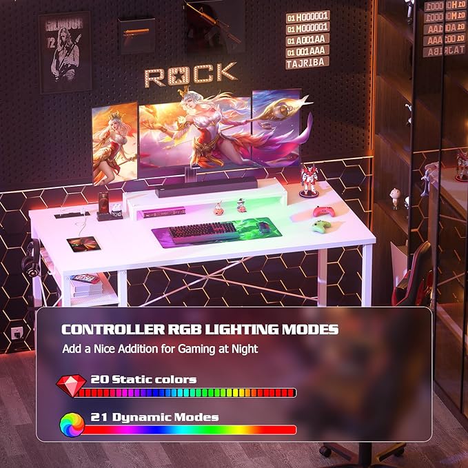 armocity Computer Desk with LED Lights, Gaming Desk with Power Outlet and USB, 40 Reversible Laptop Table with Moveable Monitor Stand, Small Desk for Small Spaces, Office, Gaming Room, White