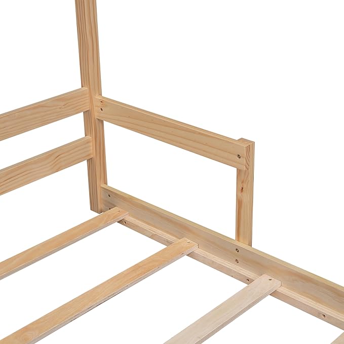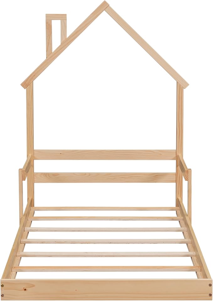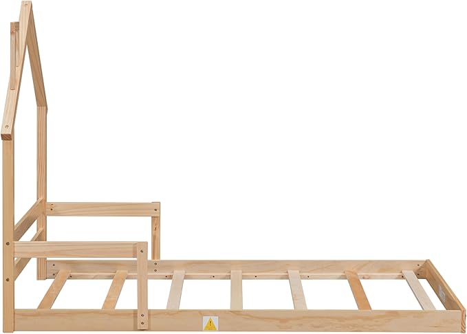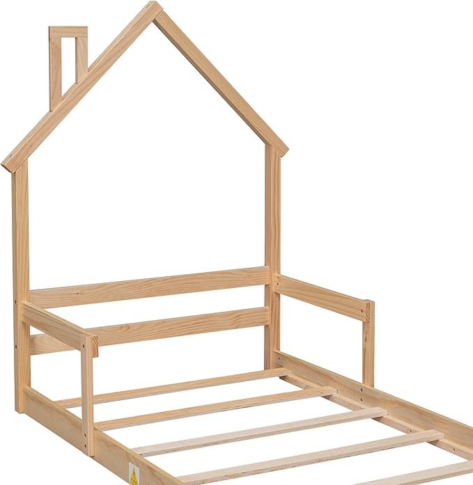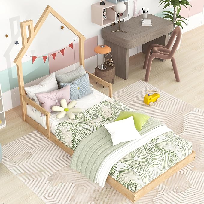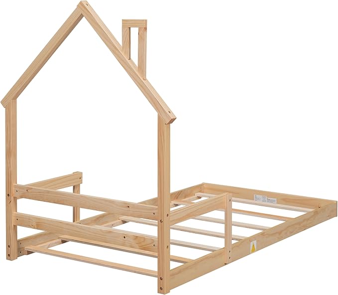 Bellemave Twin Size House-Shaped Headboard Floor Bed for Kids,Montessori Floor Bed with Handrails and Slats,Wood House Bed Twin for Girls,Boys(Twin,Natural)