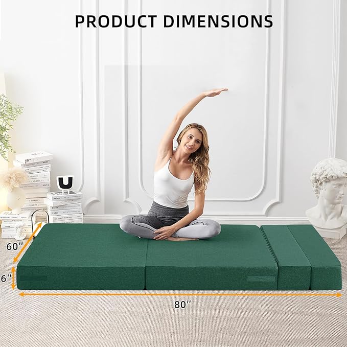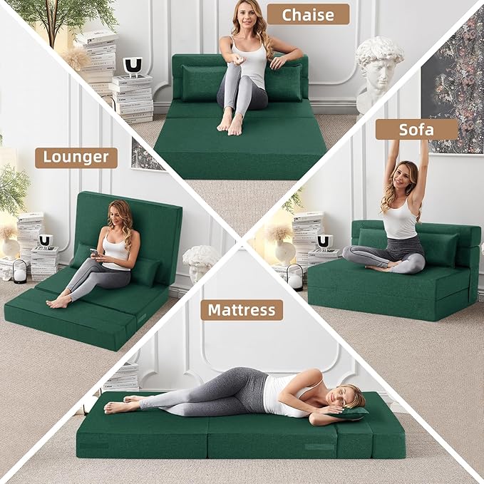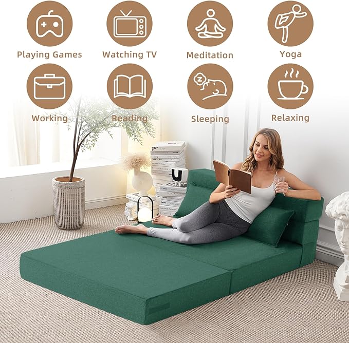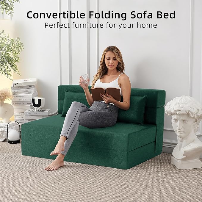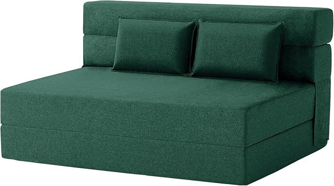 Convertible Folding Sofa Bed-Sleeper Chair with Pillow, Modern Linen Fabric Floor & Futon Couch, Foldable Mattress for Living Room/Dorm/Guest Use/Home Office/Apartment, Queen Size,Dark Green