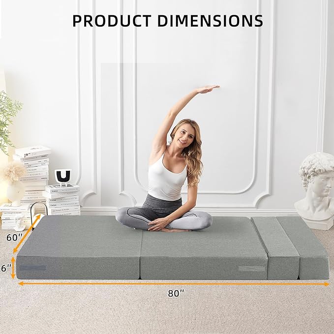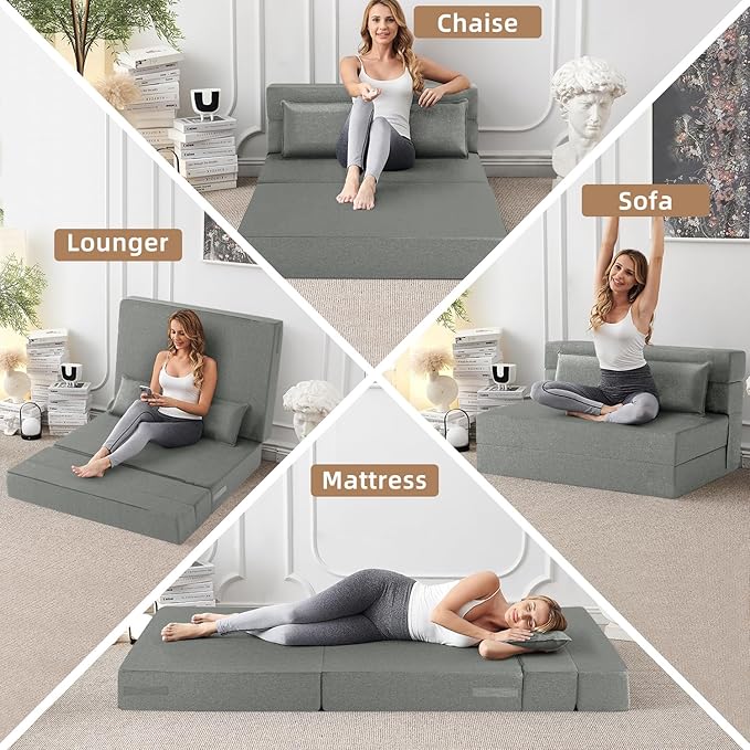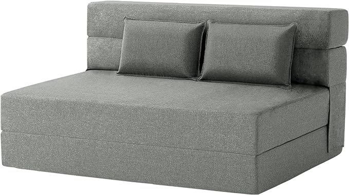 Convertible Folding Sofa Bed-Sleeper Chair with Pillow, Modern Linen Fabric Floor & Futon Couch, Foldable Mattress for Living Room/Dorm/Guest Use/Home Office/Apartment, Queen Size, Light Gray