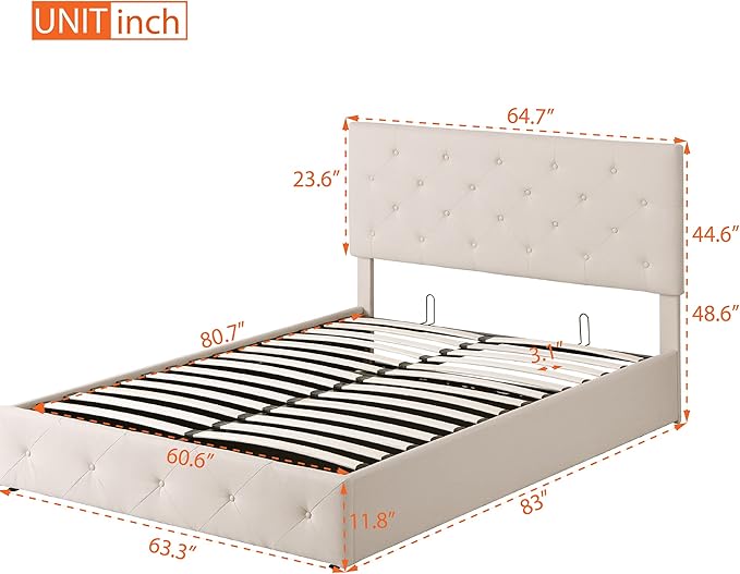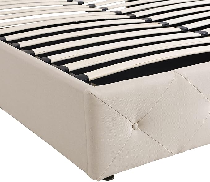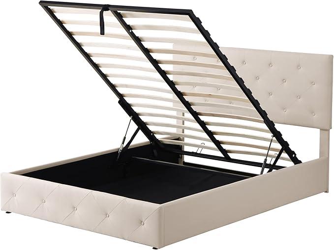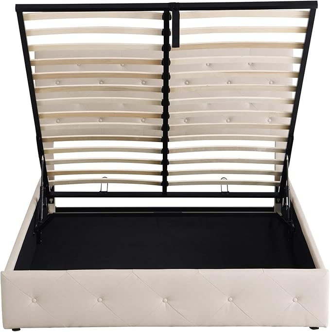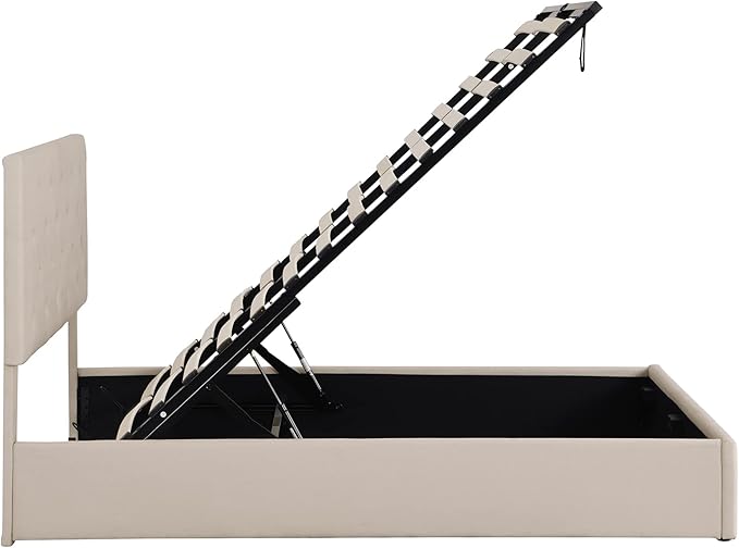 Queen Upholstered Platform Hydraulic System, Lift Up Storage Bed Full Size with Headboard and Button Tufted, Wooden Bedframe for Teens Adults, Beige