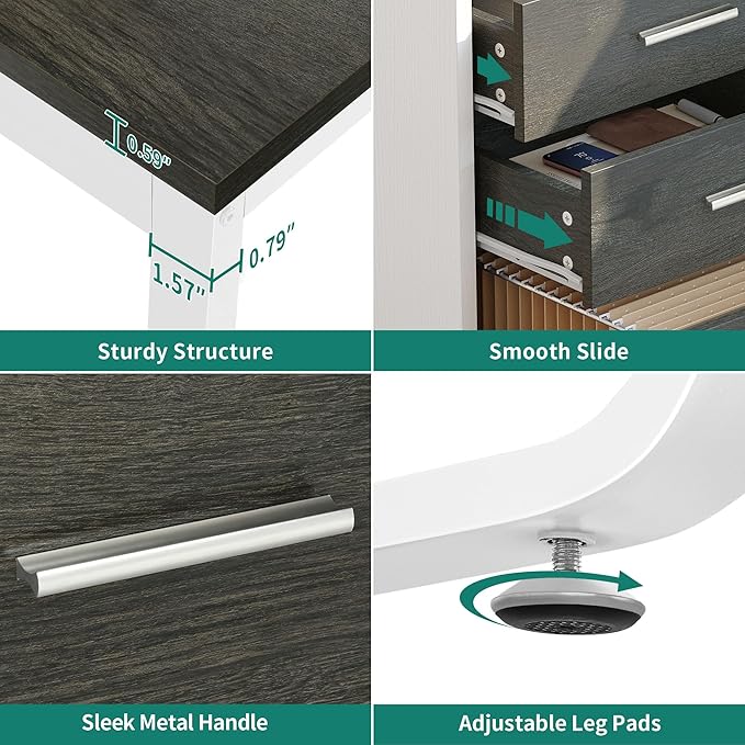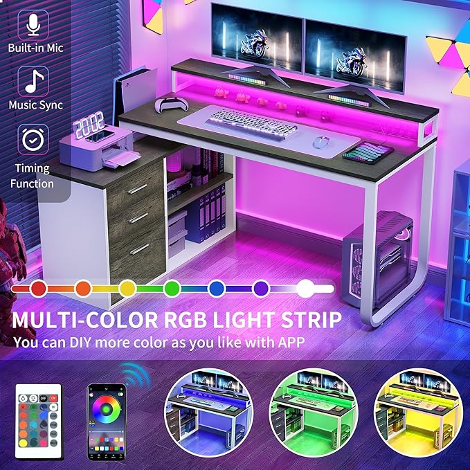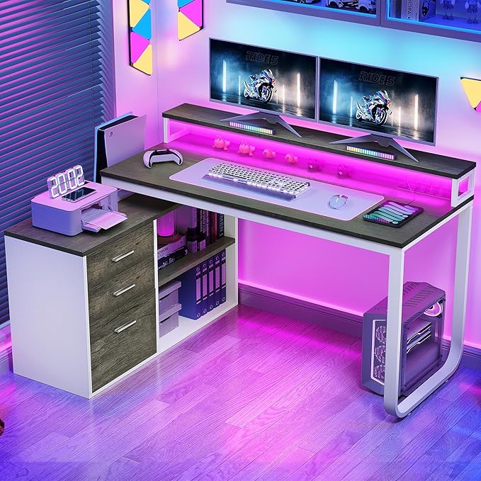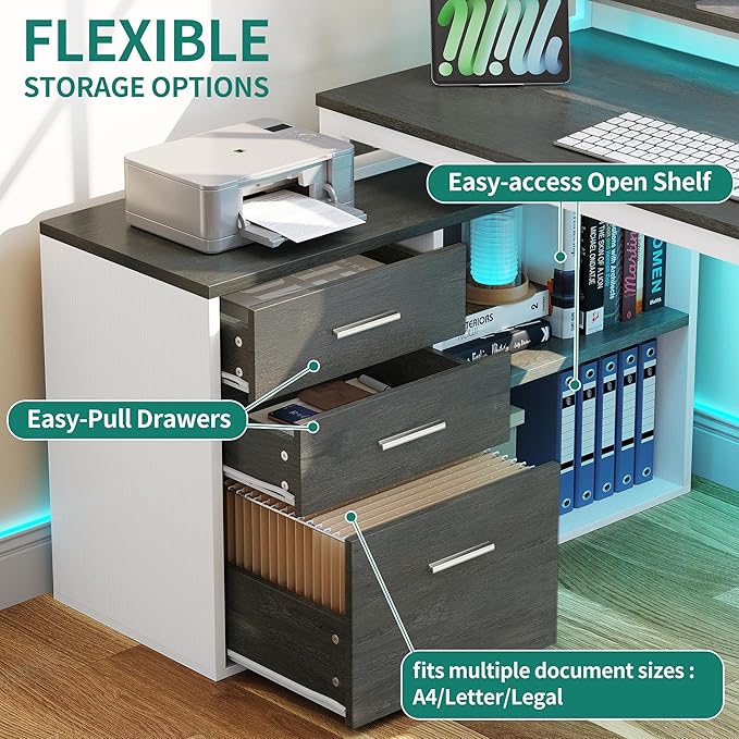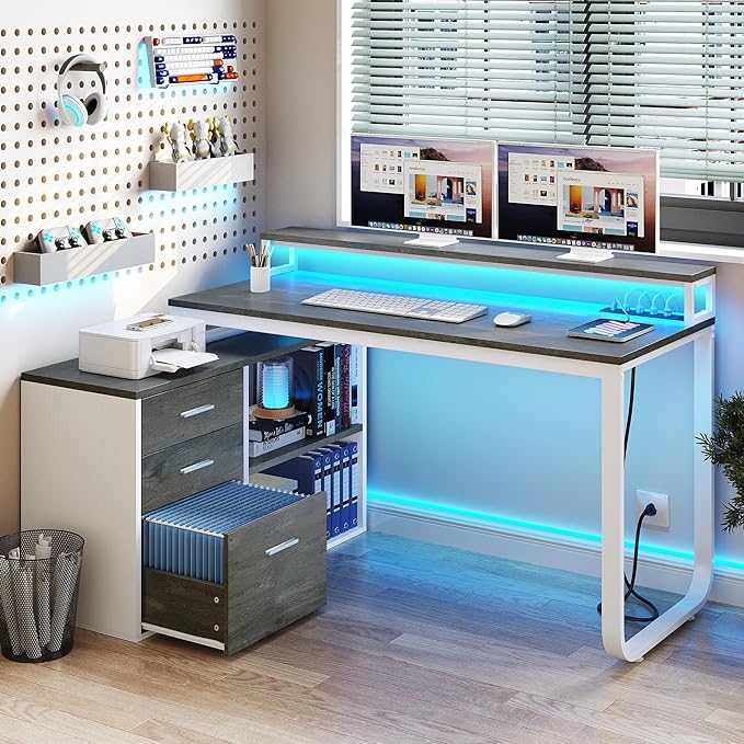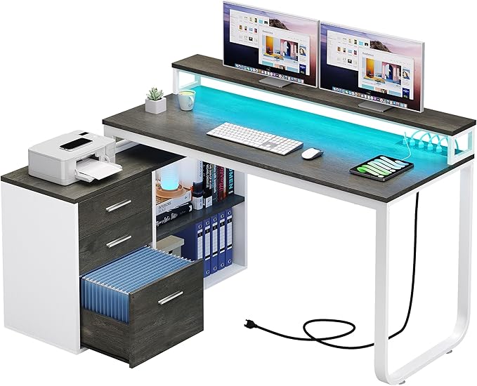 YITAHOME L Shaped Desk with Power Outlets & LED Lights & File Cabinet, 55" Corner Computer Desk with 3 Drawers & 2 Storage Shelves, Home Office Desk with Monitor Stand, White & Grey