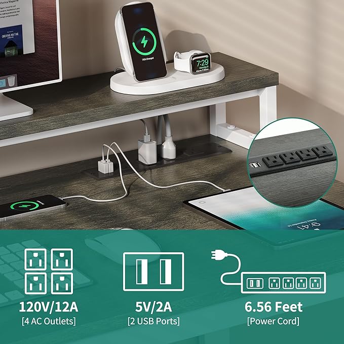 About This Convenient charging station: This L-shaped computer desk features 2 USB ports, 4 power outlets & a 6.56ft power...