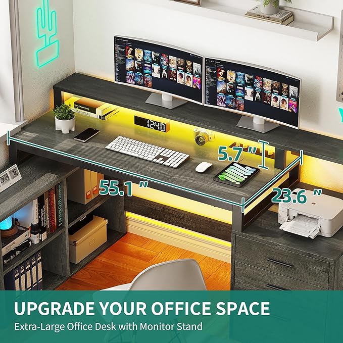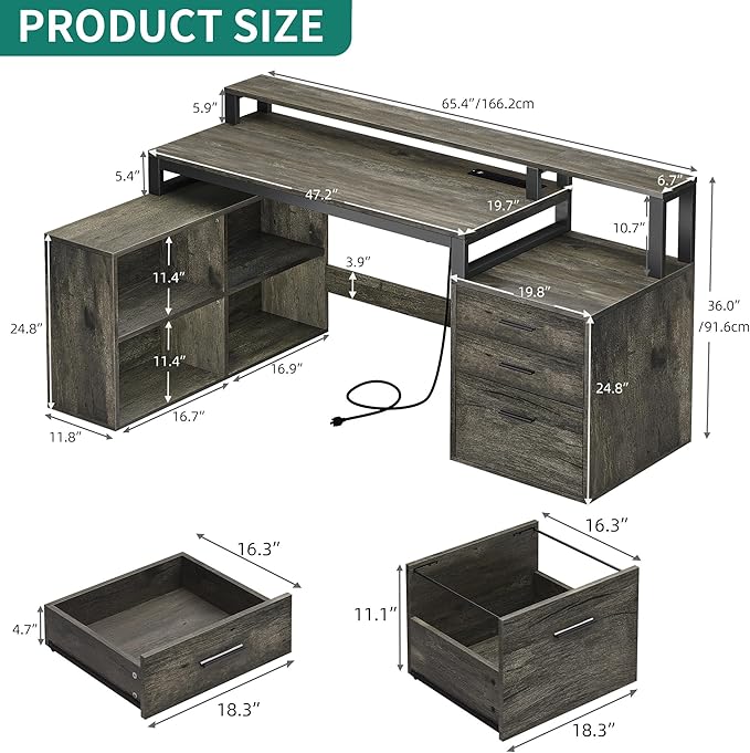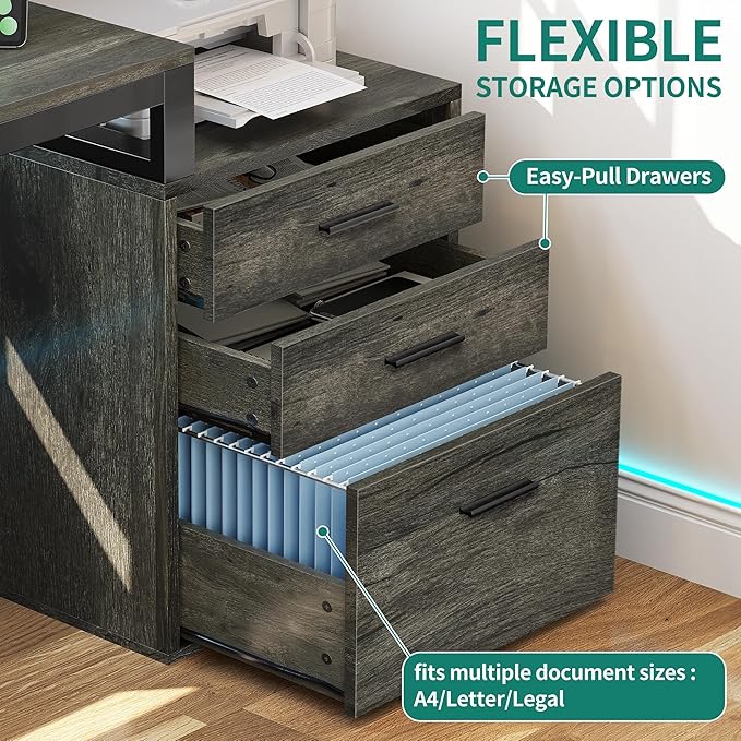 YITAHOME L Shaped Desk with 3 Drawers, 65" Corner Computer Desk with Power Outlets & LED Lights, L-Shaped Desk with File Cabinet & Printer Stand for Home Office, Grey