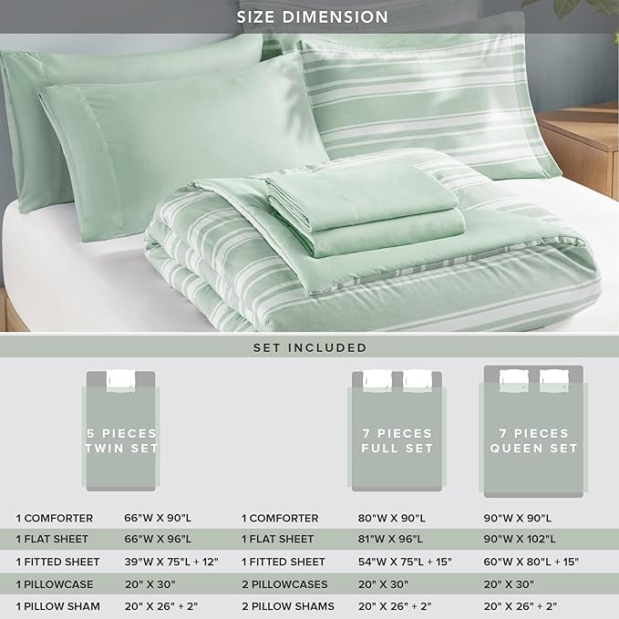 Codi Queen Comforter Set 7 Piece, Sage Green White Striped Bed in a Bag Reversible, Cationic Dyeing Shabby Chic Bedding Sets with Comforter, Sheets, Pillowcases & Shams