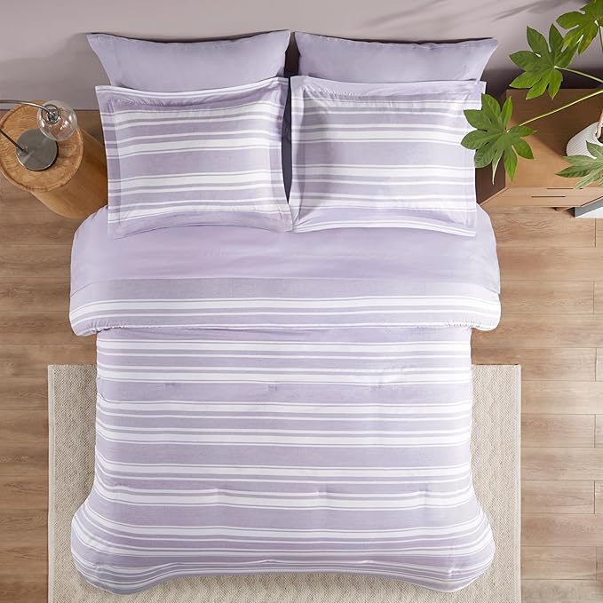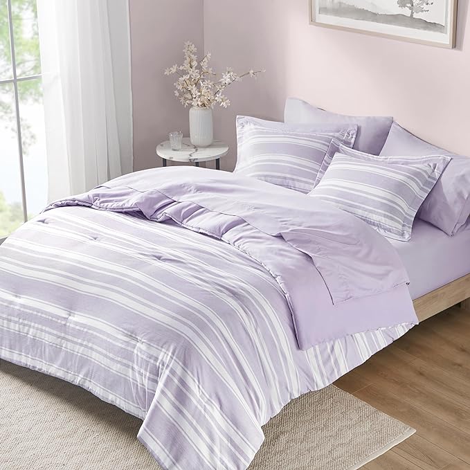 Codi Full Comforter Set 7 Piece, Lavender Purple Striped Bed in a Bag Reversible for All Seasons, Cationic Dyeing Bedding Sets with Comforter, Sheets, Pillowcases & Shams