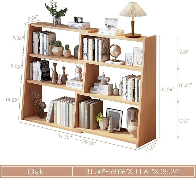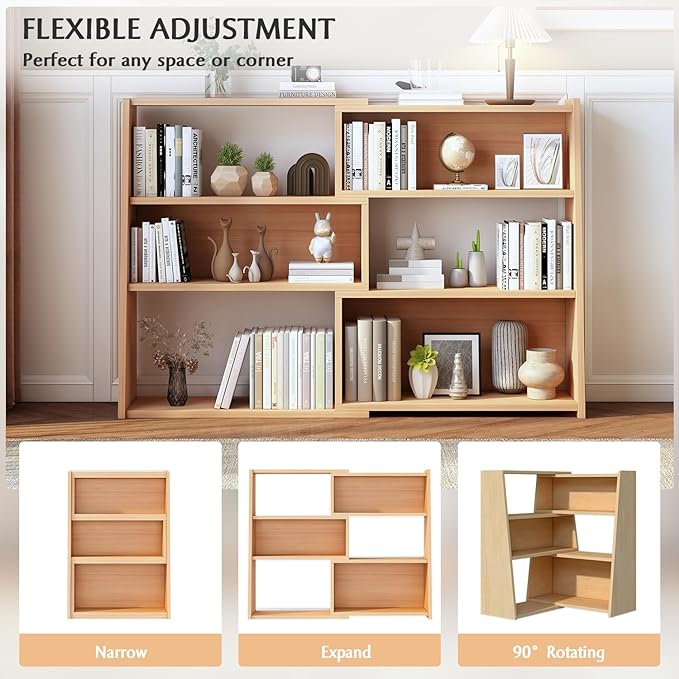 IOTXY Wooden Extendable Shelf Bookcase - 3-Tier Ladder Low Short Bookshelf for Small Space or Corner, Oak, L