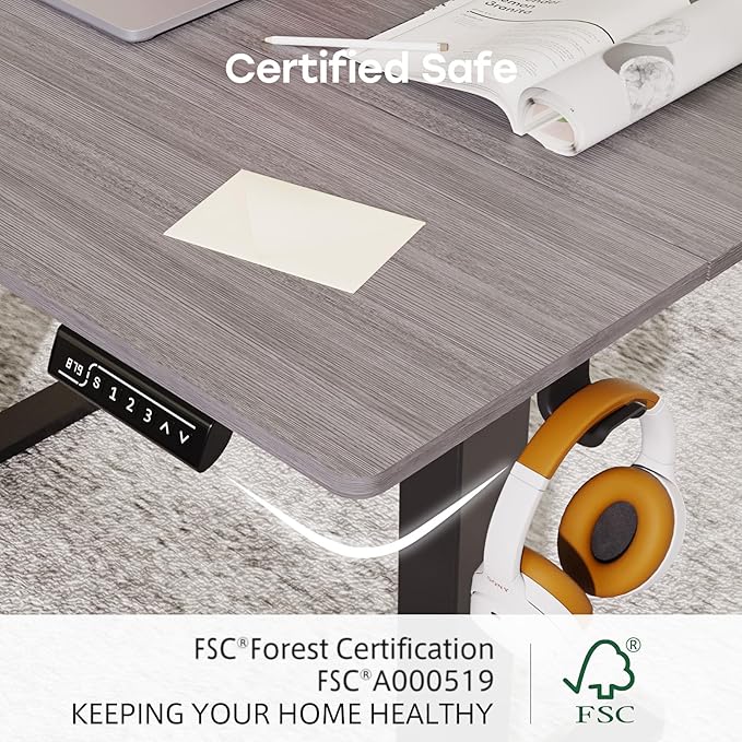 Grey Standing Desk, 48 X 24 Inch Adjustable Height Electric Desk, Sit Stand Desk with 2 Hooks, Ergonomic Rising Desk with Splice Board