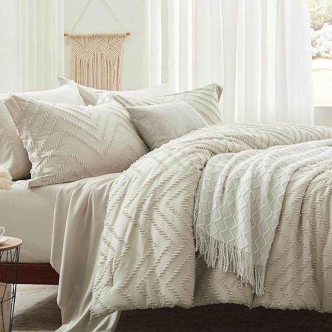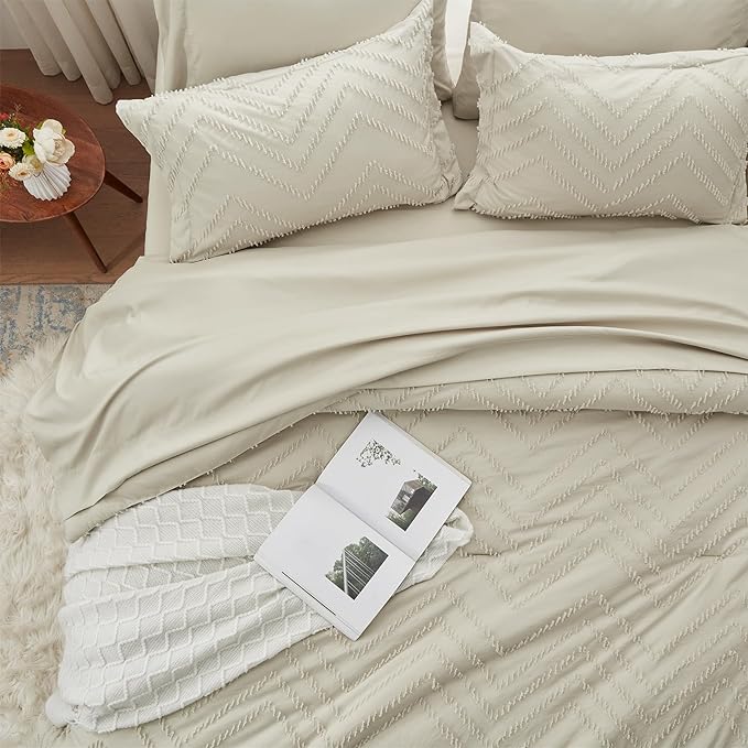 Anluoer Full Comforter Set, Oatmeal Tufted Bed in a Bag 7 Pieces with comforters and sheets, All Season Bedding Sets with 1 Comforter, 2 PillowShams, 2 Pillowcases, 1 Flat Sheet, 1 Fitted Sheet