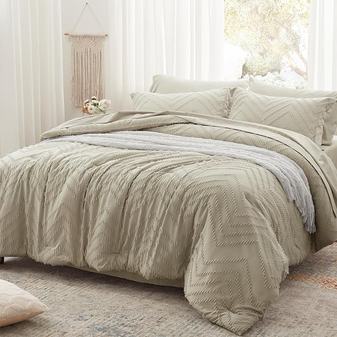 Anluoer King Comforter Set, Oatmeal Tufted Bed in a Bag 7 Pieces with comforters and sheets, All Season Bedding Sets with 1 Comforter, 2 PillowShams, 2 Pillowcases, 1 Flat Sheet, 1 Fitted Sheet