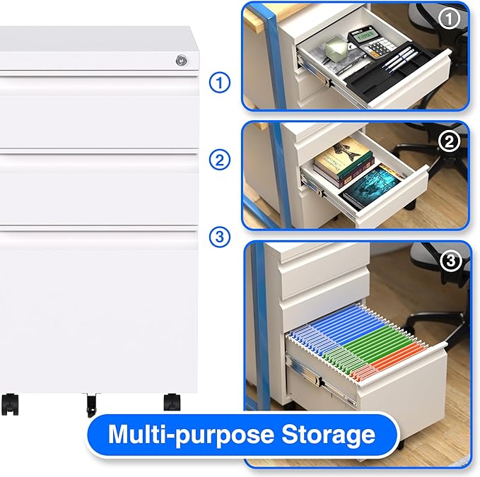 Mobile File Cabinet Under Desk, 3 Drawers Metal File Cabinet with Wheels, Rolling Filing Cabinets with Lock for Home Office Letter/Legal/A4