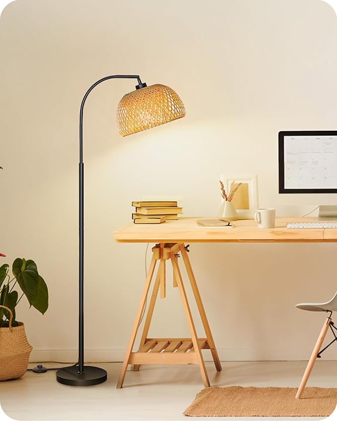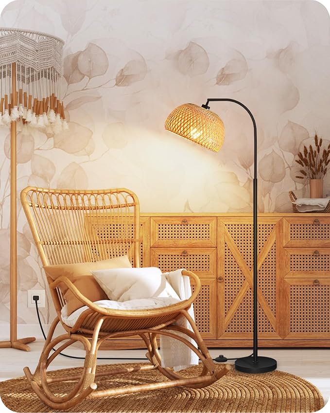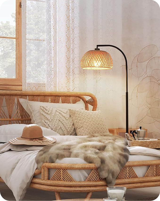 Boho Floor Lamp, Dimmable Floor Lamp, Bamboo Shade Corner Floor Lamp, Reading Lamp Height Adjustable with Remote, for Living Room, Bedroom, Study Room, 10W LED Bulb Included, Black B9LD05