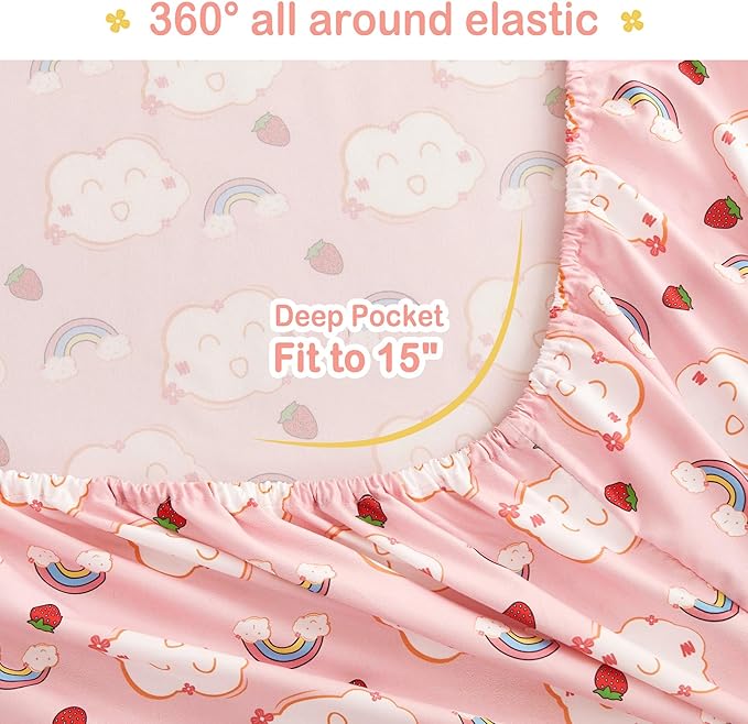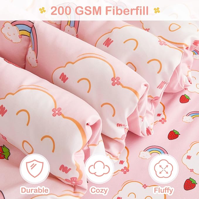 Mooreeke Bed in a Bag for Kids Girls Teens, 7 Pieces Full Size Comforter Bed Set with Shams, Sheet Set, Rainbow Cloud Strawberry Pink Super Soft Microfiber Kids Comforter Bedding Set