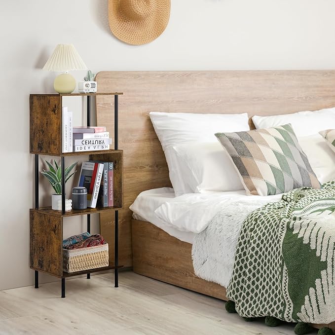 smusei 4 Tier Book Shelf Small Rustic Brown Bookshelf Organizer for Small Spaces S-Shaped Wood Corner Bookcase for Bedroom, Living Room, Study Room and Home Office