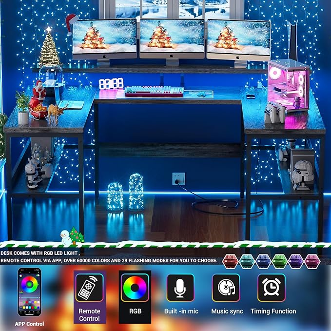 Customizable U Shaped Computer Desk with Adjustable Monitor Stand, Reversible L Shaped Gaming Desk with Power Outlet and Smart LED Light, Sturdy Office Desk with Storage Shelves, Black Oak