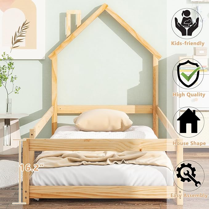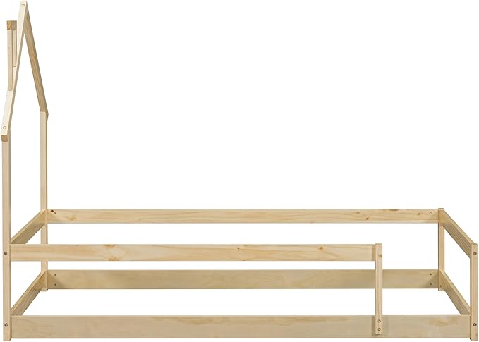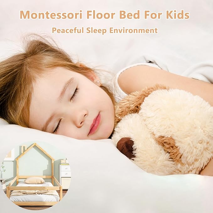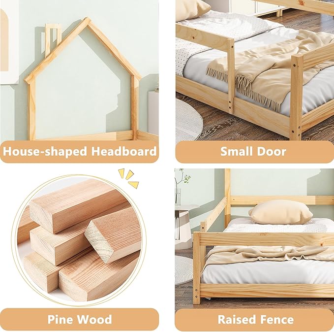 Bellemave Twin Size House-Shaped Headboard Floor Bed with Fence,Wooden Montessori Floor Bed for Kids,House Bed Twin Frame for Girls,Boys (Natural)