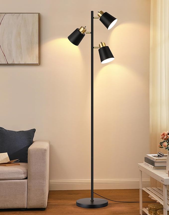QiMH Tree Floor Lamps for Living Room, 67" Modern Standing Floor Lamp with 3 LED Bulb, Industrial Tall Lamp Reading Lighting for Bedroom Study Office Decor, 3 Rotatable Light Heads, Black Gold