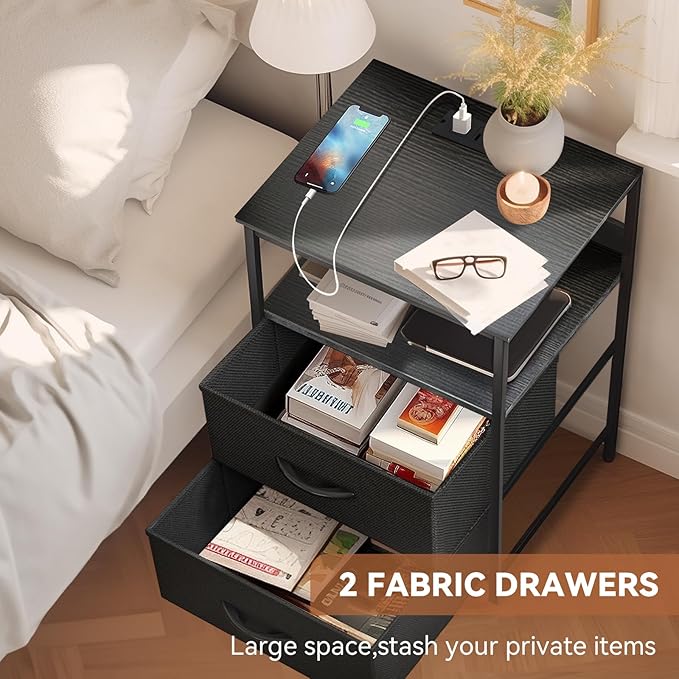 Nightstand with Charging Station, Bedside Table with Fabric Drawers, End Table with Open Shelf, Side Table with USB Ports & Outlets, Night Stand for Bedroom, Black