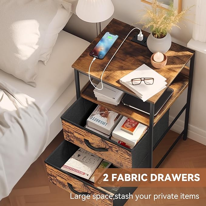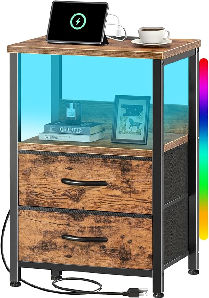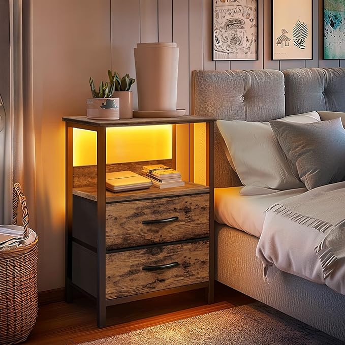 Nightstand with Charging Station, Bedside Table with LED Lights, Side Table with Fabric Drawers and Storage Shelf, Night Station with USB Ports & Outlets, Small End Table for Bedroom, Rustic Brown
