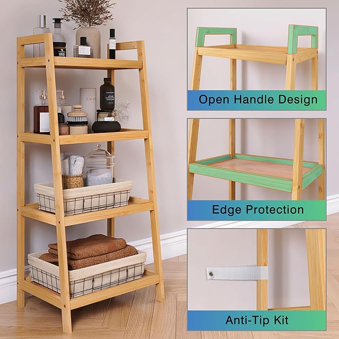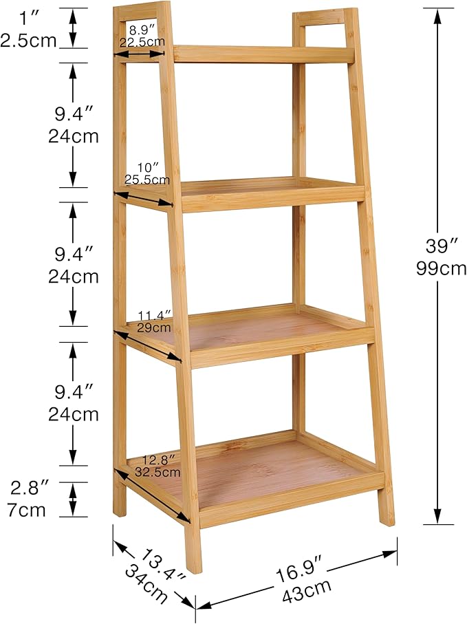 SMIBUY Bamboo Ladder Bookcase, Bathroom Storage Rack Organizer, 4 Tier Freestanding Plant Display Stand Space Saver Shelves for Bedroom, Kitchen, Balcony (Natural)