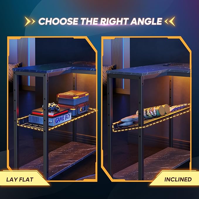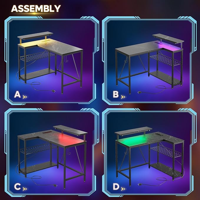 Bestier Small Gaming Desk with Power Outlets,42 L Shaped LED Computer Desk with Monitor Stand Reversible Storage Shelves,Corner Gamer Desk with Headset Hooks USB Port,Black Marble