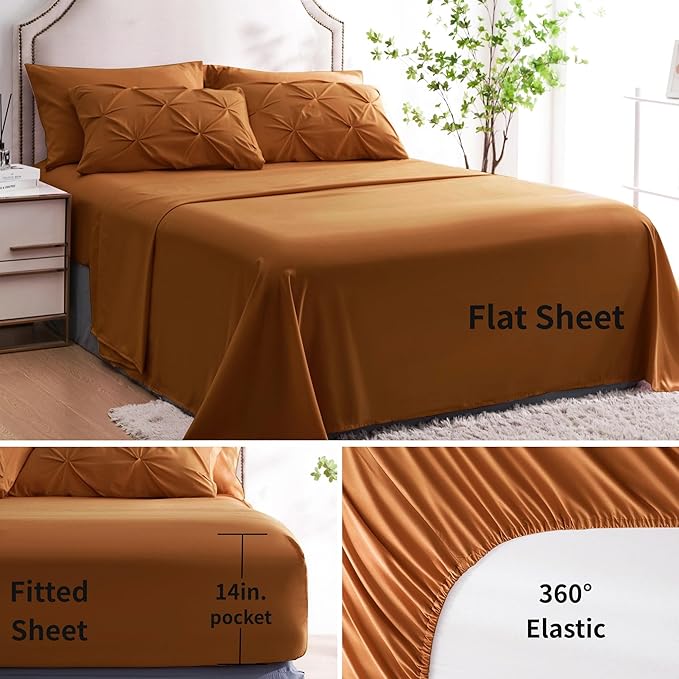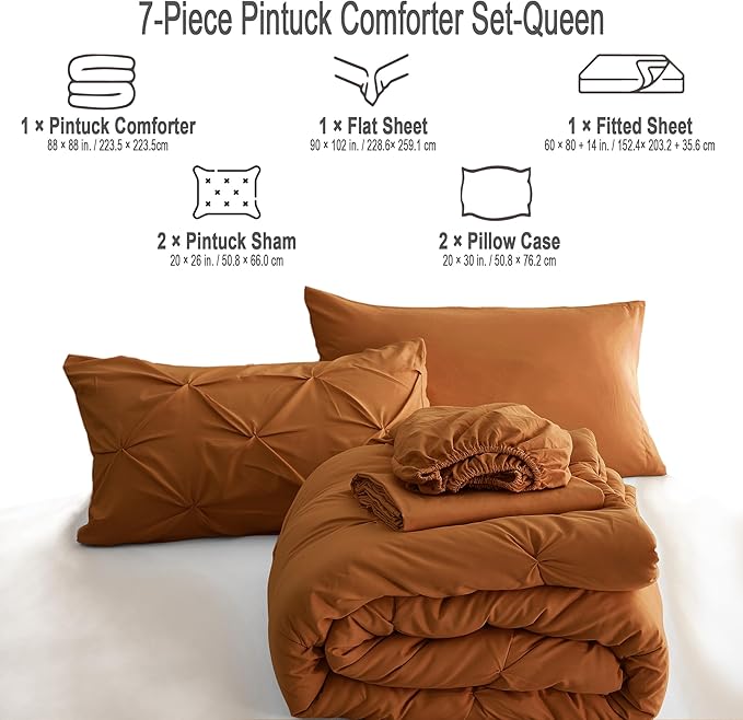 Ubauba 7pc Burnt Orange Queen Comforter Set, Rust 7 Piece Pintuck Bed in a Bag with Sheets, All Season Pinched Pleat Bedding Comforters & Sets,(Rustic, Queen Size)