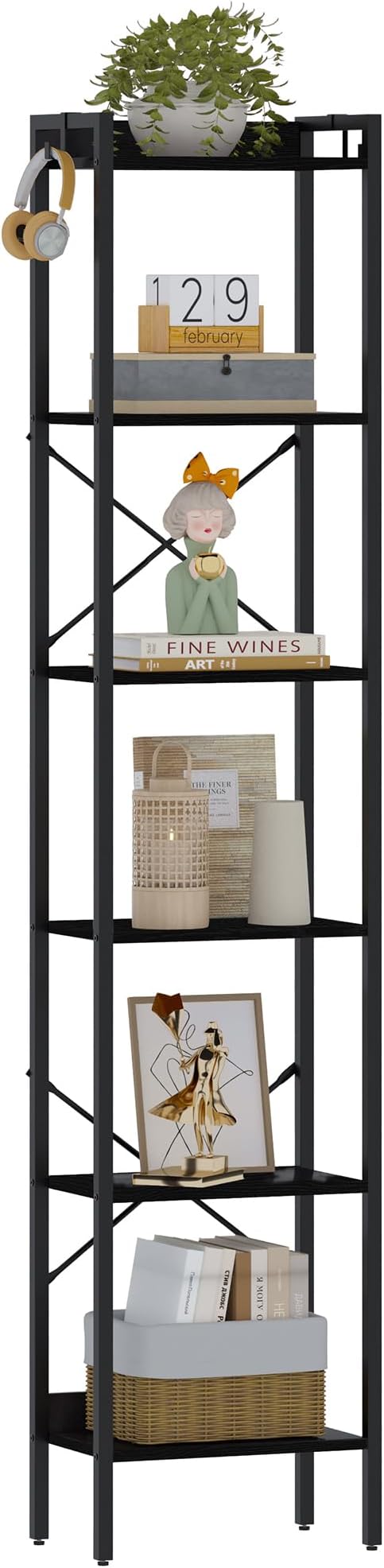 Bookshelf, Book Shelf, Industrial Bookcase with 2 Hooks, Coner Shelf Storage Organizer for Home Office, Living Room, Bedroom, Kitchen, 6-Tier Black BC10704B
