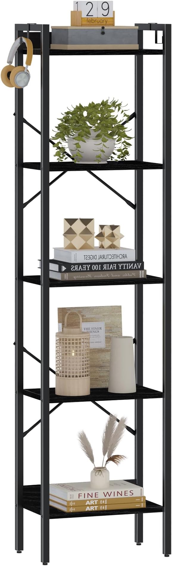 Bookshelf, Book Shelf, Industrial Bookcase with 2 Hooks, Coner Shelf Storage Organizer for Home Office, Living Room, Bedroom, Kitchen, 5-Tier Black BC10504B