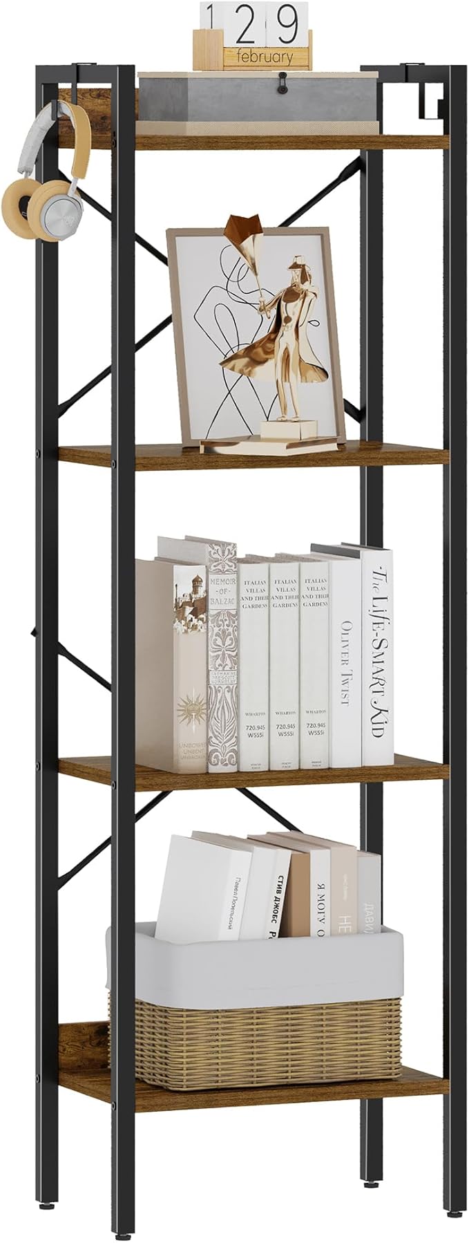 Bookshelf, Book Shelf, Industrial Bookcase with 2 Hooks, Coner Shelf Storage Organizer for Home Office, Living Room, Bedroom, Kitchen, 4-Tier Rustic Brown BC10401B