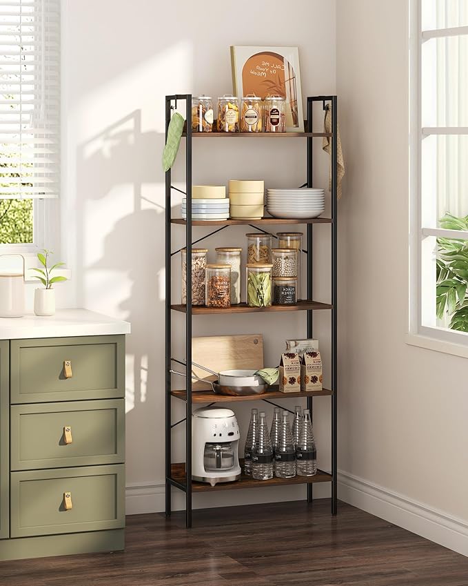 Bookshelf, Book Shelf, Industrial Bookcase with 2 Hooks, Coner Shelf Storage Organizer for Home Office, Living Room, Bedroom, Kitchen, 5-Tier Rustic Brown BC22501B